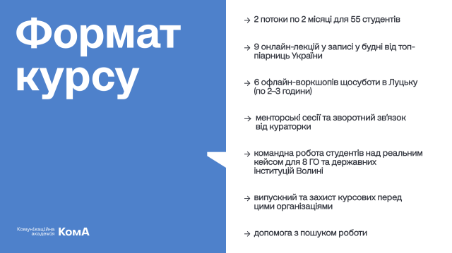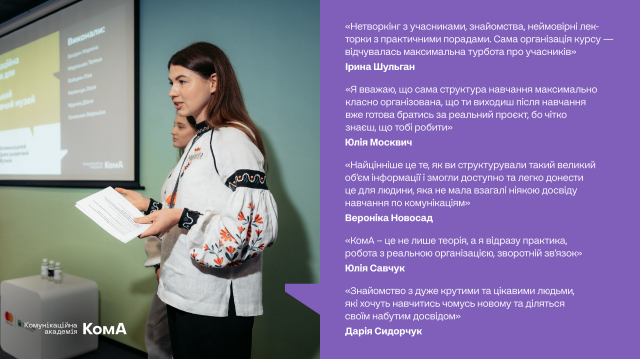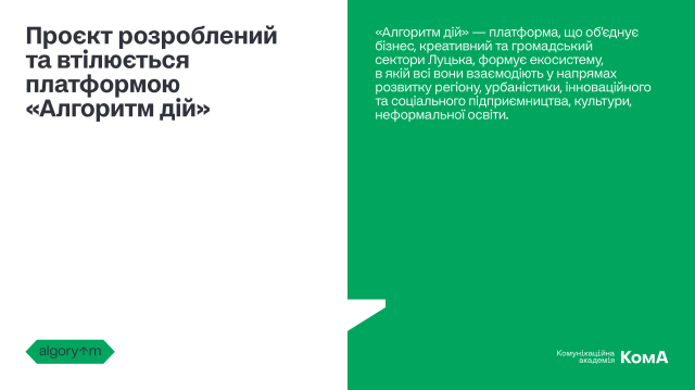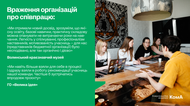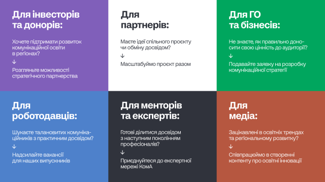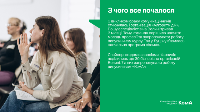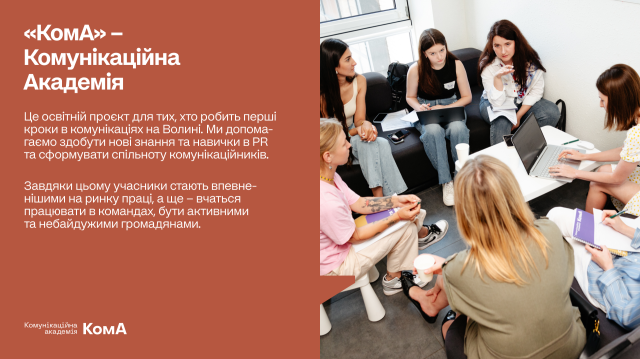 З попиту і потреби створили «КомА» (Комунікаційна Академія) — проєкт який полягає не лише в навчанні комунікацій, а й створенні ком’юніті, промоції регіону, а також — побудові моделі, яку можна масштабувати в інших містах. Перед тим як перейти до деталей, пропонуємо ознайомитися з повною презентацією результатів проєкту.