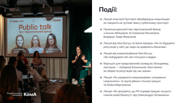 Відкриті події для всіх охочих: лекції, панельні дискусії, зустрічі з практиками, неформальні розмови про роль, стратегії та тактики комунікацій. - Курс антикризових комунікацій у Волинському національному університеті імені Лесі Українки