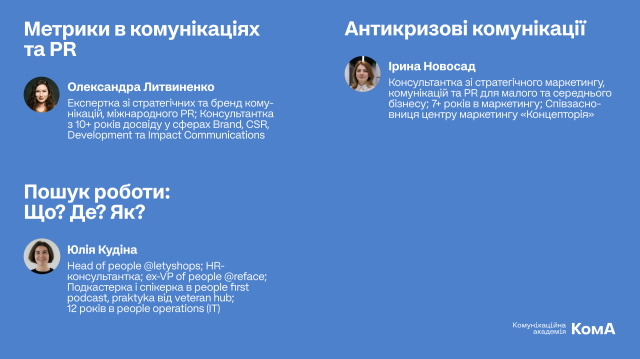 Окремим напрямом став курс з антикризових комунікацій від експертки Ірини Новосад, який стартує у 2026 році. Студенти дізнаються, як розпізнавати типи криз, створювати антикризові плани, працювати з кейсами українських компаній і формувати стратегічні алгоритми дій.