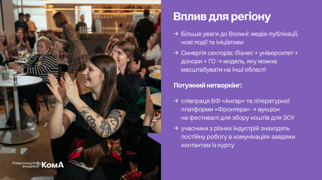 Два потоки стипендійного навчання для 30 комунікаційників-початківців — двомісячний інтенсив онлайн та офлайн. Робота з реальною комстратегією для організацій Волині. - Тематичні події та створення спільноти