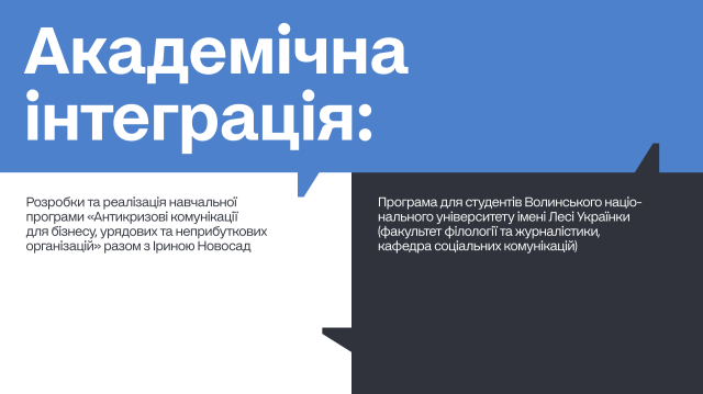 - Університет інтегрував практичний підхід у формальну освіту. Після написання програми курсу з антикризових комунікацій запросив викладачок Ірину Новосад і Людмилу Яворську розробляти інші навчальні модулі. Це створило модель оновлення формальної освіти через партнерства.