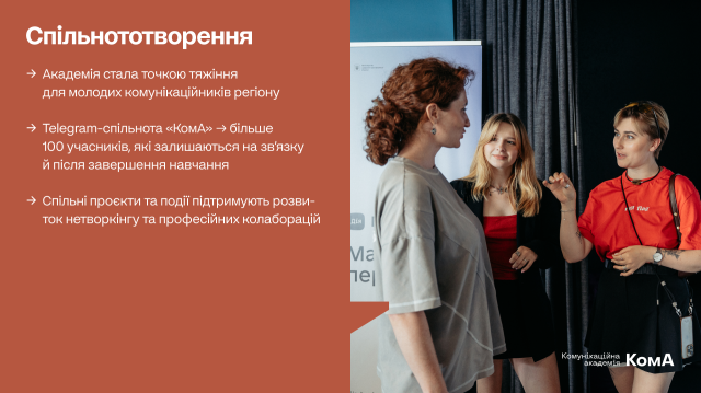Академія не завершилася випуском. Випускники та учасники подій від Академії об’єдналися у спільноту КомА — Telegram-групу. Там діляться можливостями, роботою, запитами, подіями, співпрацюють між собою і створюють власні ініціативи.